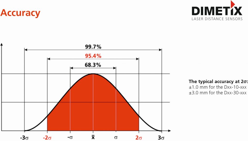 The D-Series laser distance sensors are suitable for distances of 0.05 m to 500 m and measure with an accuracy of +/- 1 mm with a repeatability of +/- 0.3 mm. They usually use orange reflective foil as the reflector. At distances up to 100 m, the named accuracy values also apply to natural surfaces. The devices can deliver reliable measurement results even with black target surfaces or in direct sunlight if used outdoors. Their measurement accuracy is specified with a statistical certainty of 95.4 % (as defined by ISO 1938‑2015). This is equivalent to +/- 2σ, i.e. twice the standard deviation (Fig. 3). This already takes into consideration any distance errors due to the effects of temperature as well as linearity errors. The maximum measurement speed is 250 Hz with an output rate of 1 kHz. Users can also benefit from all these properties in the extended temperature range from -40 °C to +60 °C.