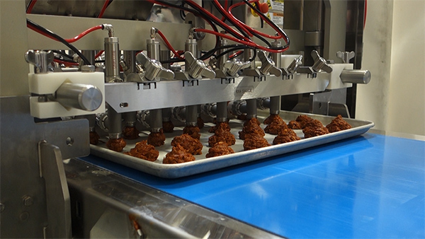 Unlike pneumatic depositors, the Servo Multi features programmable touch screen controls, capacity to store 100 recipes, and six depositing modes to choose from. It also possesses a built-in ability to control a pan conveyor or act as a slave to an automated conveyor-based production system to add further efficiency to the overall production process. Gentle portioning ensures product integrity with little to no breakdown.