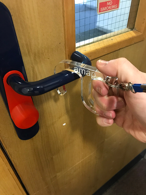 “These handles attach to a lanyard and avoid touching door handles. One of our colleagues also pointed out that a pair could even be used to push a supermarket trolley!”