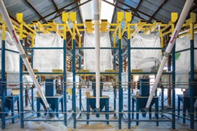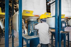 Once the recipe is programmed for a batch, each ingredient is conveyed by a flexible screw conveyor from a bulk bag discharger to a central weigh hopper. Load cells supporting the hopper transmit weight gain amounts to the controller, which steps-down the conveyor’s feed rate to dribble before stopping it once the precise batch weight has been gained. The system weighs up to 30 batches per day, with improved accuracy and reduced labour.