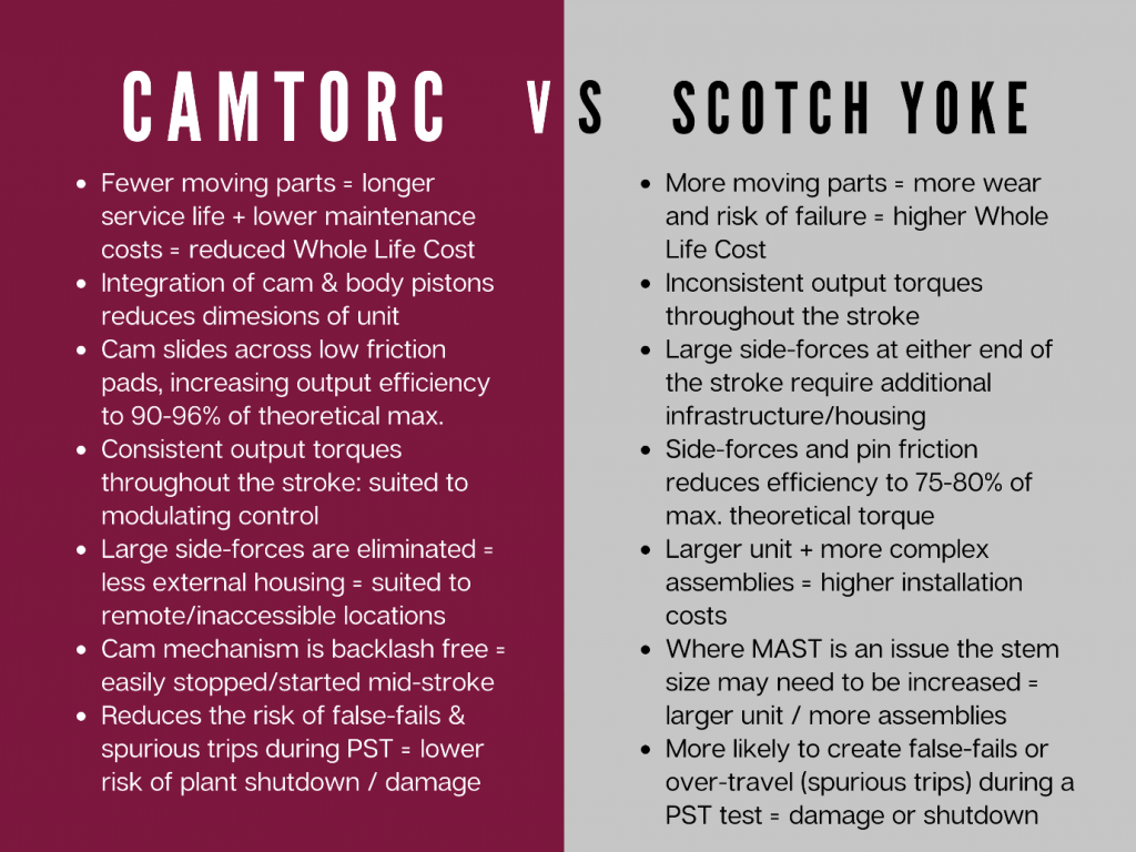 - To prevent over-travel a maximum pressure drop is often set, but on a scotch valve actuator this is usually very close to the pressure required to start moving the valve. Therefore, if the valve sticks a little (which often happens when a valve has been inactive) the test might fail erroneously: since a slightly lower pressure would cause the valve to move. With Camtorc, the larger pressure differential on the spring stroke allows for much more control of the PST system, and the maximum permissible pressure drop is far less likely to abort the test.