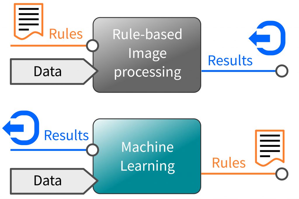 The main difference to rule-based image processing is how and by whom image characteristics are identified and how the learned knowledge is represented. With the classical or “symbolic approach” an image processing specialist is responsible for selecting the image features that are decisive and describing them according to certain rules. Many lines of source code are required to specify in detail how to solve a given task, because the software can only recognize what the rules define. The subsequent execution takes place within set limits without any room for interpretation. Therefore, the actual intellectual achievement lies solely with the image expert.
