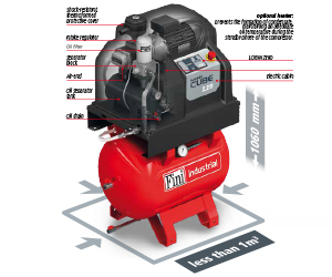 MiniCUBE is the new oil-lubricated coaxial compressor with direct starter, the smallest of the entire FINI screw range. The small size of the air-end/motor connection system allows the machine to maintain an extremely small footprint. Furthermore, thanks to its extreme quietness, only 65 dB(A), it can be placed near any operating environment. MiniCUBE is available in the floor mounted version or on a painted or galvanised 90-litre tank.