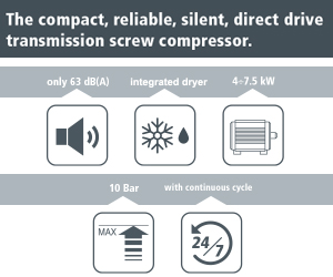 MiniCUBE is designed for continuous operation in industrial applications. The coaxial transmission, with the air-end directly connected to the electric motor without any flexible coupling, ensures the best transmission efficiency. The three-phase versions are equipped with an IE3 energy efficiency class motor. The FS14 air-end ensures minimum pressure losses, providing considerable energy savings and low operating and maintenance costs. 100 dB(A) 120 dB(A) with continuous cycle 24 7.
