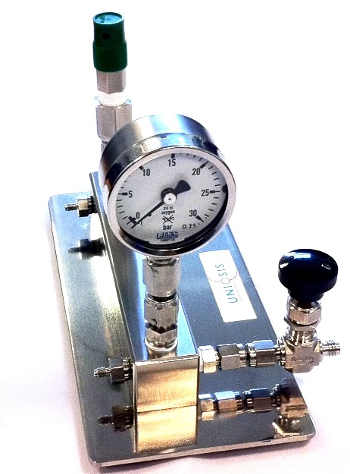 Gas Manifold (Optional; UQ1095M): An optional Gas Manifold is available for use with the GAM II if required. This is made of stainless steel and comprises an inlet with gas burst relief valve and an outlet with a pressure gauge and needle valve. The seals in the valve are made of Viton as standard.