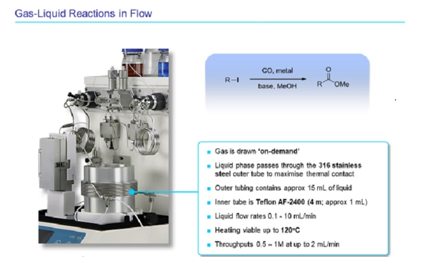 The Gas Addition Module from Uniqsis provides a safe and efficient means of performing gas-liquid reactions undercontinuous flow-through conditions. Its primary purpose is to provide a solvent feed stream pre-saturated with gas, but it can also be used as a reactor in its own right.