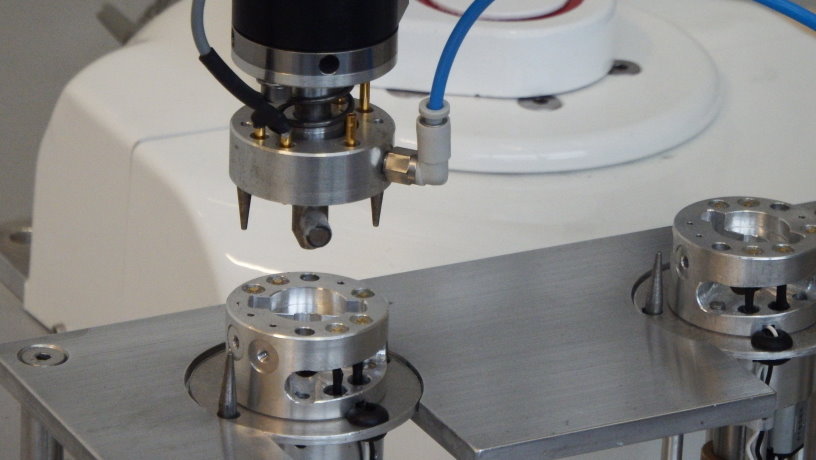 One problem with such small robots as the R12 is the mounting flange is necessarily small. This means that most industrial end effectors such as grippers will not fit. Especially no commercially available tool changer will fit; they are all too large and heavy. There are amateur level robots available where you can change the tool manually but in an application where for example a gripper is required for one part of the process and a vacuum pickup for another then an automatic tool changer is essential. For this ST have developed a unique tool changer that requires no pneumatics or electrics to operate. It works with a rotate and lock mechanism like a bayonet. See picture (3). It can pass through 3 pneumatic circuits and 5 electrical circuits with gold contacts.