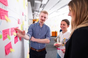 The agile working method is based, among other things, on the principle of ongoing improvements for both products and methods. For example, the teams convene for a ‘sprint review’ at the end of each sprint. They present their results to all the employees in a kind of marketplace. This means that when they plan the next sprint afterwards, consideration can also be given to issues arising at short notice as a top priority. Then there is the ‘retrospective’, when the teams share observations from the last sprint and work together to identify measures for improvements in the next sprint. The beauty of it all is that these regular exchanges put the developers in a position where they can make decisions themselves, which is crucial not only for product advancement, but for this style of teamwork as well. Hierarchical delegation becomes a thing of the past as a result, while knowledge is scaled to maximum effect and made available to everyone. That’s how you develop for the future.